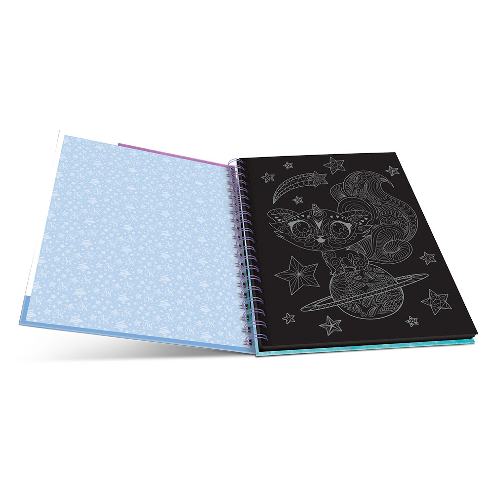 • širok izbor mandala, zentangli, geometrijskih i običnih stranica za bojenje. sav je sadržaj ispisan na crnim stranicama te sadrži perforaciju za otkidanje listova.