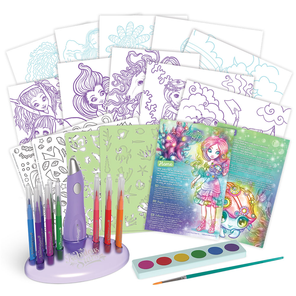 Set također uključuje šablone, vodene boje i marker za prekrivanje.