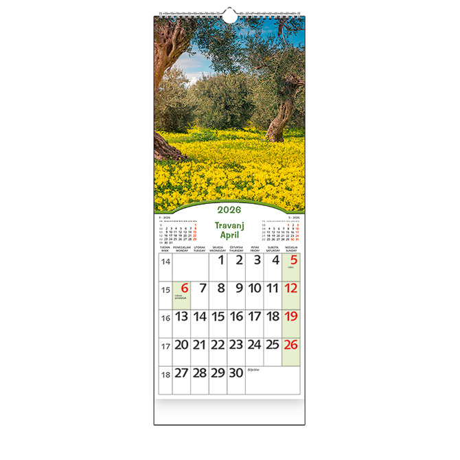 Kalendar uski okomiti; 13 listova; dimenzija: 16,5×42 cm; pasica za dotisak 7 cm; spirala