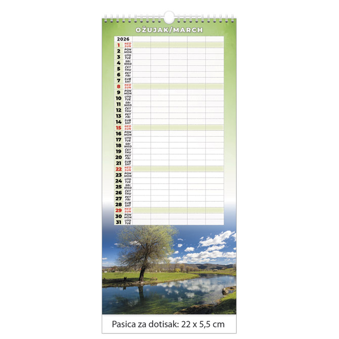 Kalendar 13 listova; dimenzija: 22×48,5 cm; pasica za dotisak 5,5 cm; spirala; planer dnevnih aktivnosti za obitelj