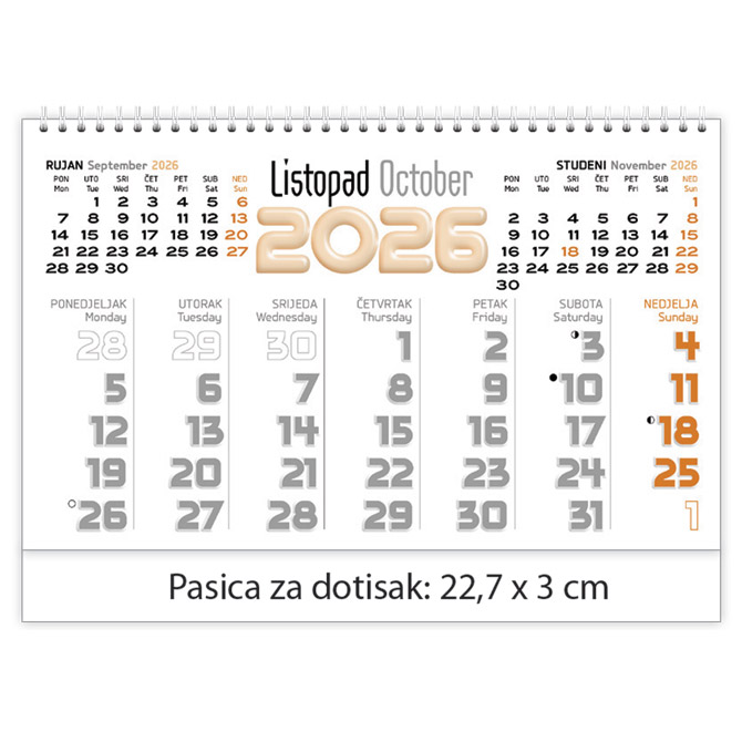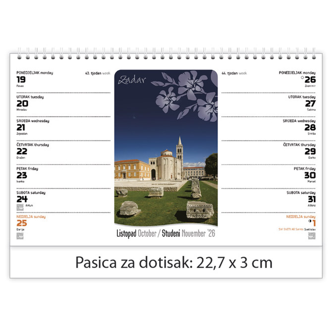 Kalendar stolni planer dvotjednik, 2 tjedna na jednoj stranici; 30 listova (kunstdruck, sjajni, 135 g/m2); dimenzija: 22,7×14 cm; pasica za dotisak: 3 cm; spirala
