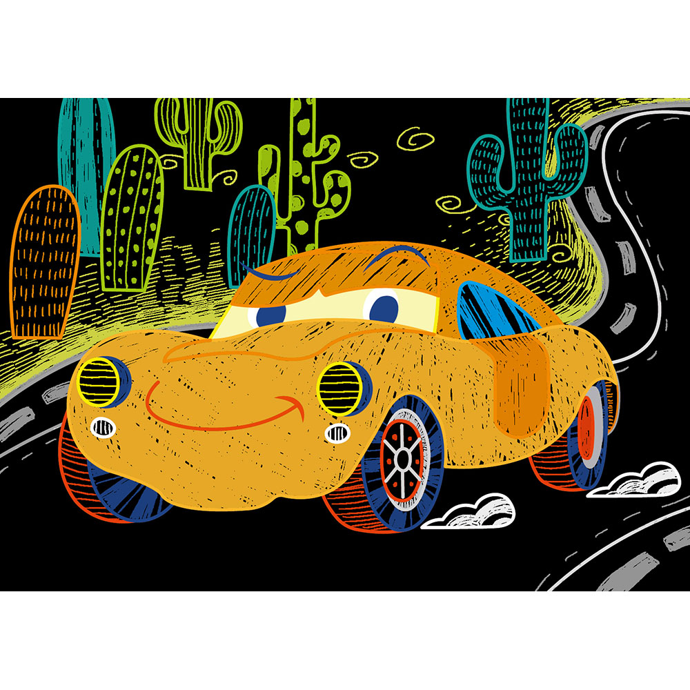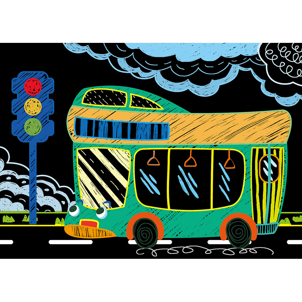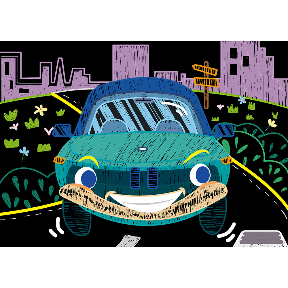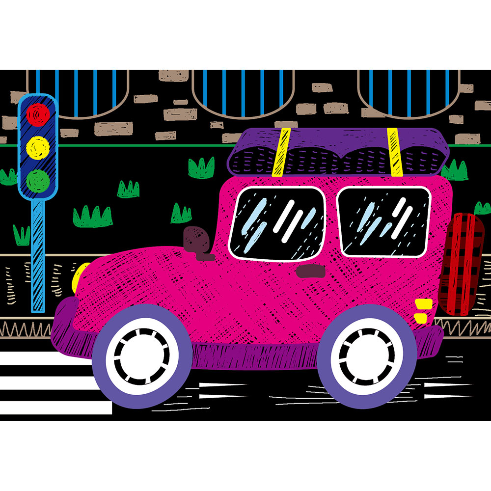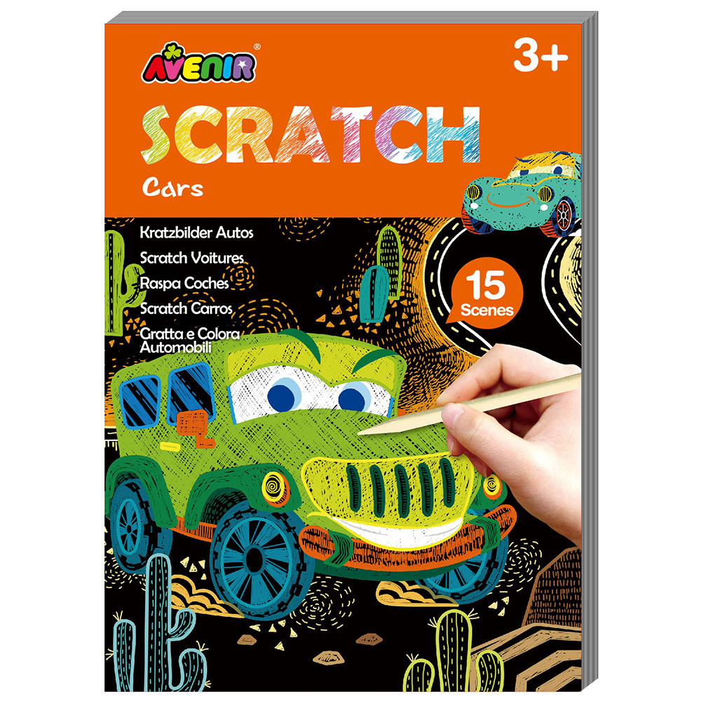 Mini grebalica za zabavu u pokretu! 15 zabavnih stranica za grebanje ispunjenih automobilima i drugim vozilima – spremnih za dodavanje novih boja i dekoracija posebnim alatom za grebanje.
