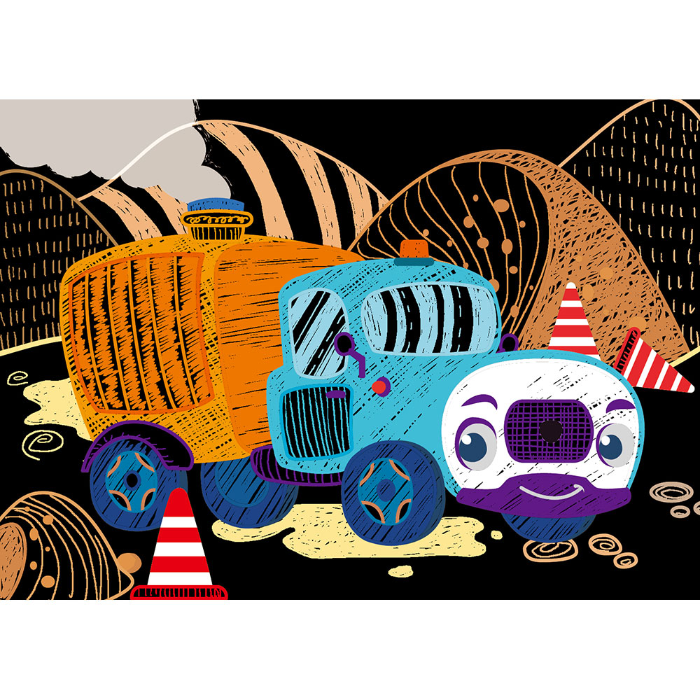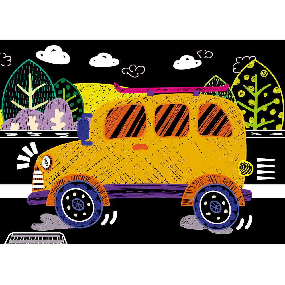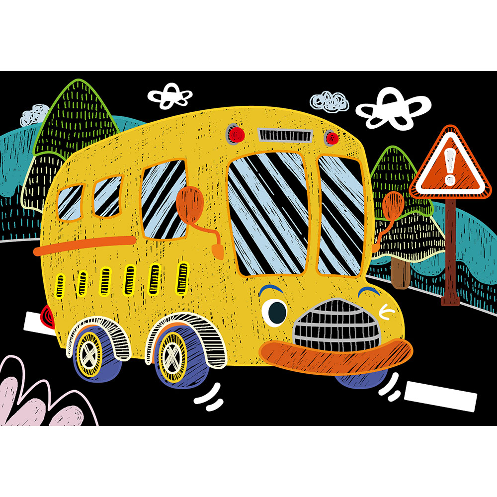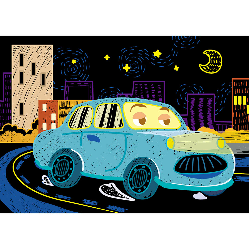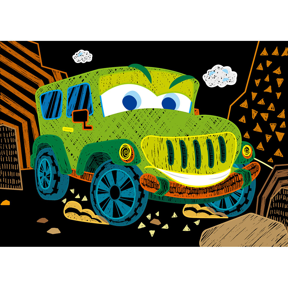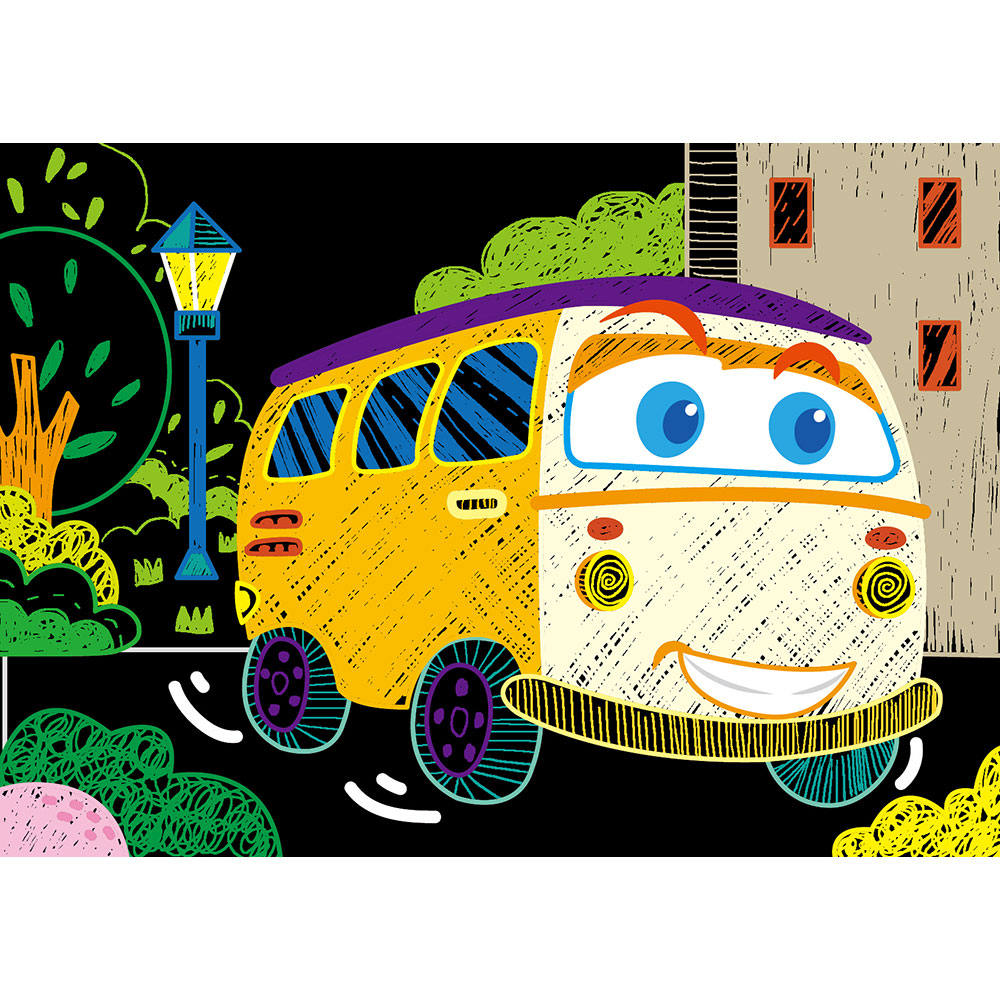 Mini grebalica za zabavu u pokretu! 15 zabavnih stranica za grebanje ispunjenih automobilima i drugim vozilima – spremnih za dodavanje novih boja i dekoracija posebnim alatom za grebanje.