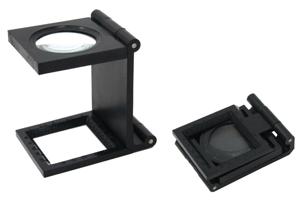Sklopivo povećalo Fold, s trostrukim povećanjem. Dimenzije: 6×4,5×1,8 cm. Ovo povećalo je samostojeće jer ima crni plastični stalak koji se rasklopi ili sklopi.