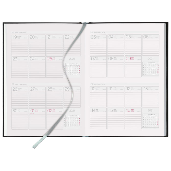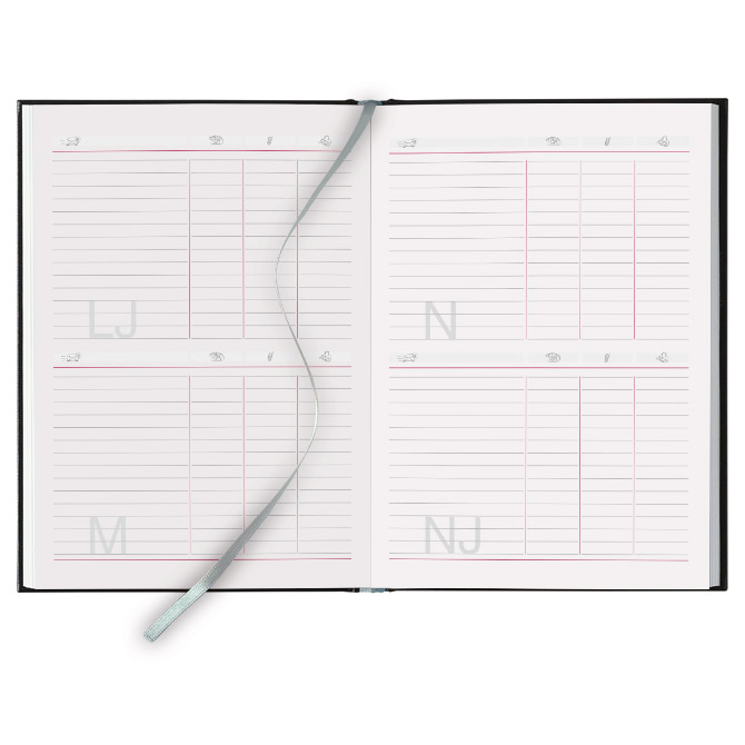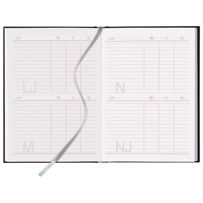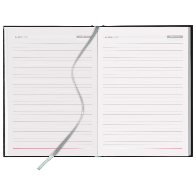 Rokovnik, može se koristiti više godina; knjižni blok: 224 stranice (sa adresarom); 70 g/m2; bijeli papir; korica je izrađena od materijala koji je pogodan za: sitotisak, suhi žig, foliotisak zlatni/srebrni i foliotisak u boji