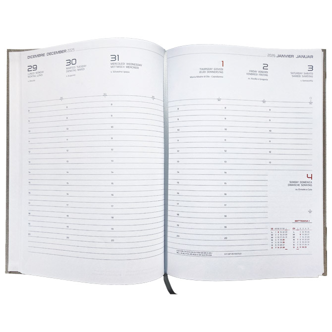 Rokovnik tjedni format: B5; knjižni blok: 144 stranice (sa adresarom); 70 g/m2; bijeli papir; s perforacijom na rubovima; jedan tjedan na dvije stranice; korica je izrađena od materijala koji je pogodan za: suhi žig